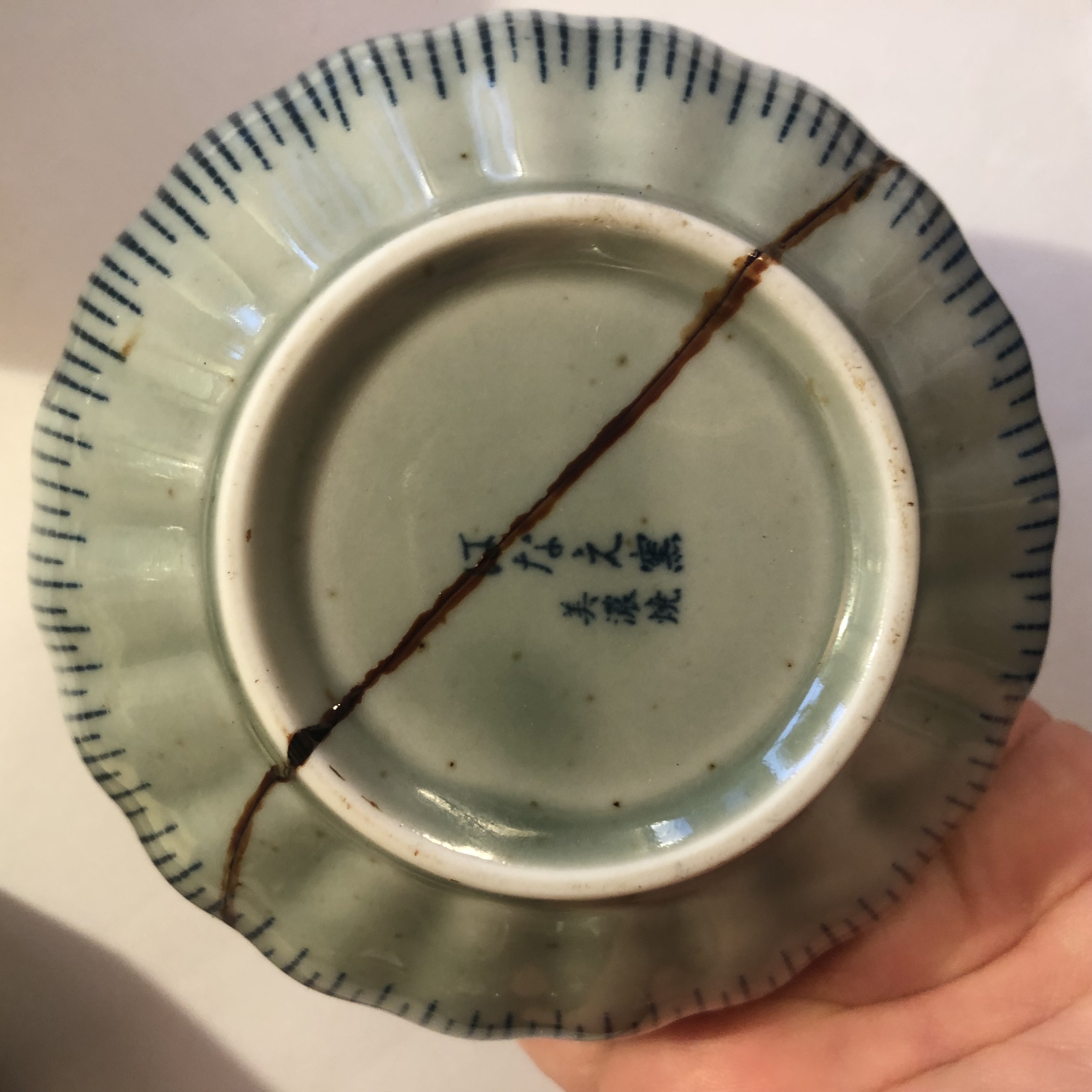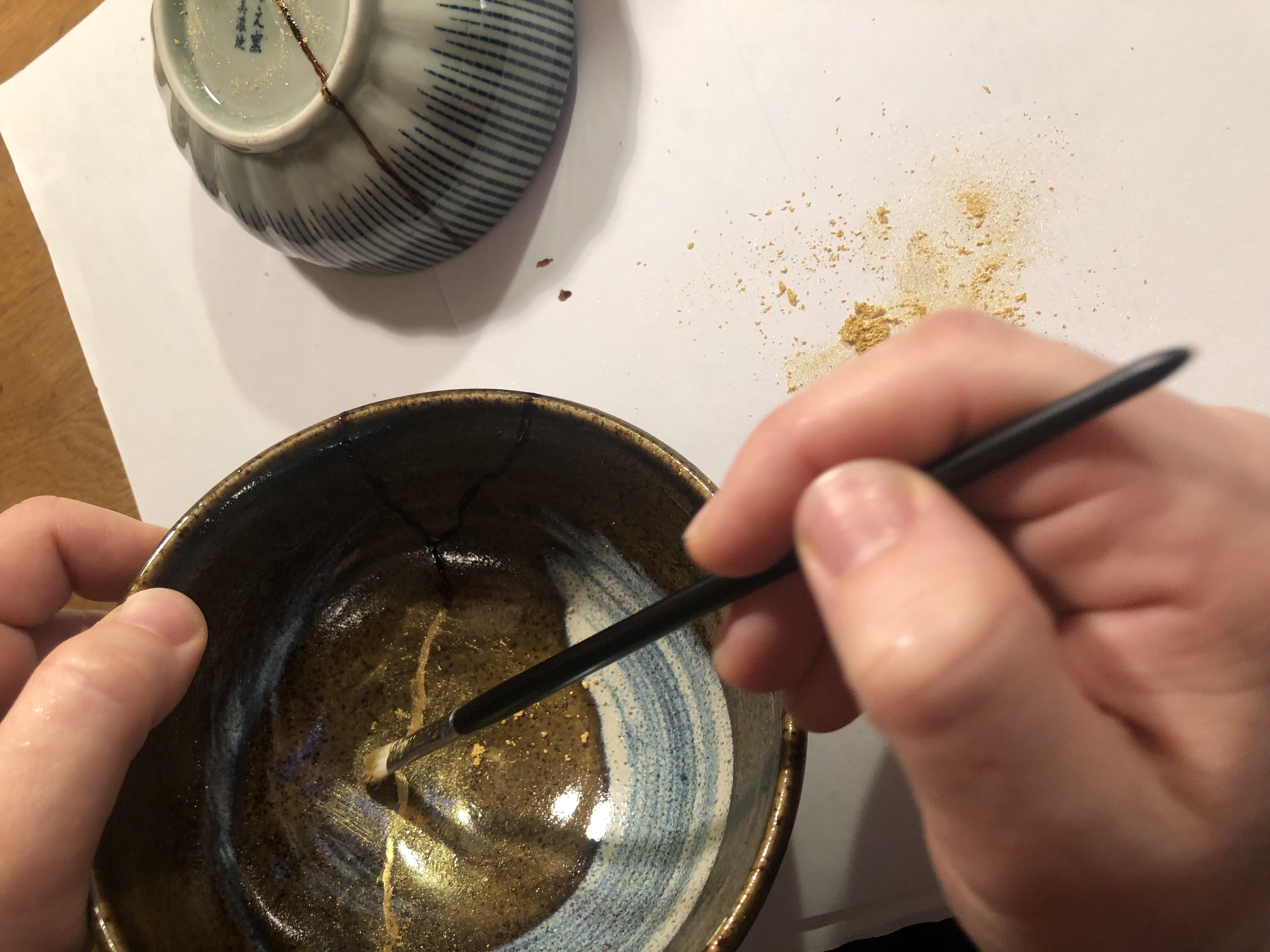 Kintsugi, 金継ぎ= etwas mit Gold bzw. Metallpulver zusammenfügen. Kintsugi ist eine traditionell japanische Methode zerbrochene Keramik mit Urushi, einem natürlichen Lack gewonnen aus dem Saft des Urushibaumes, und Goldpulver zusammenzufügen.