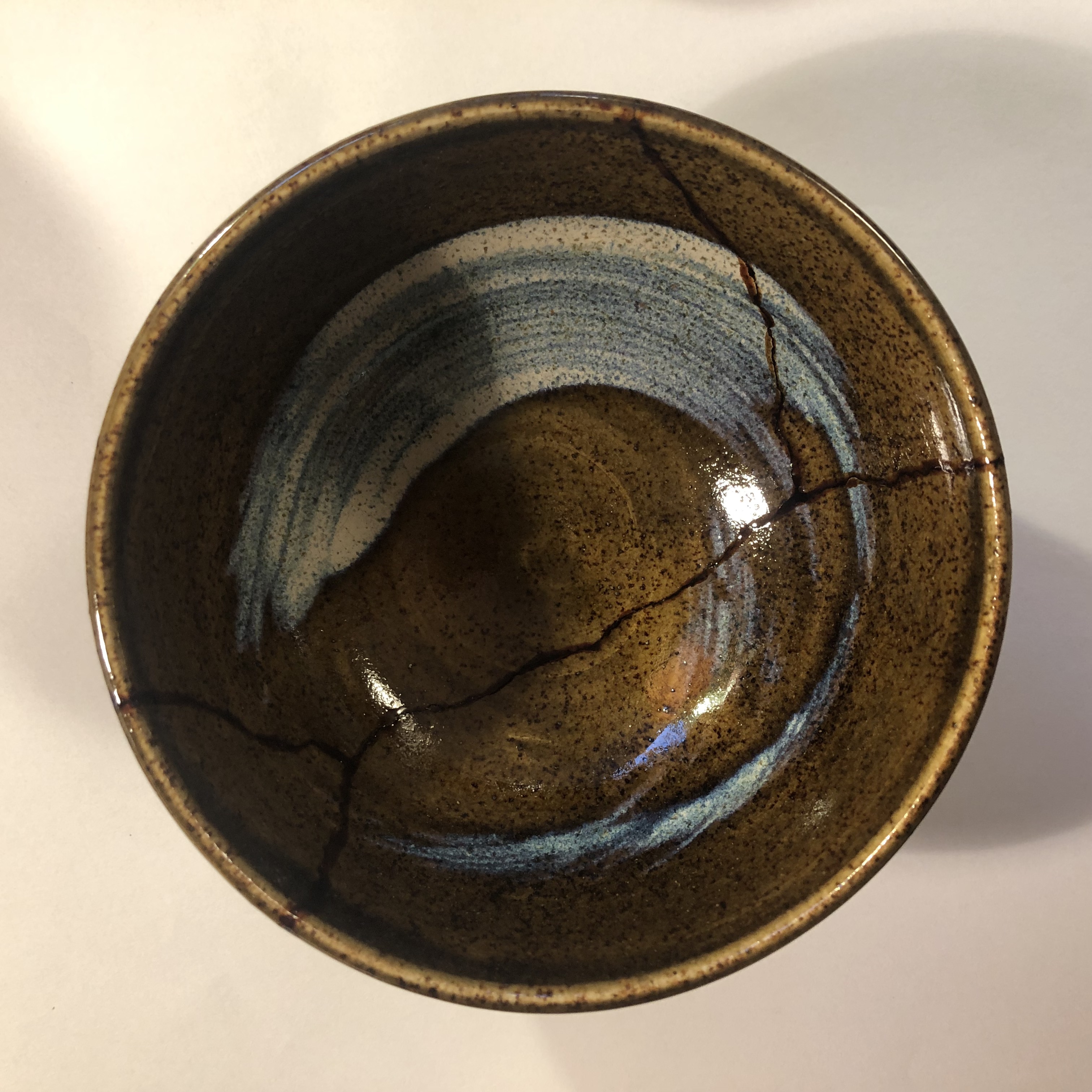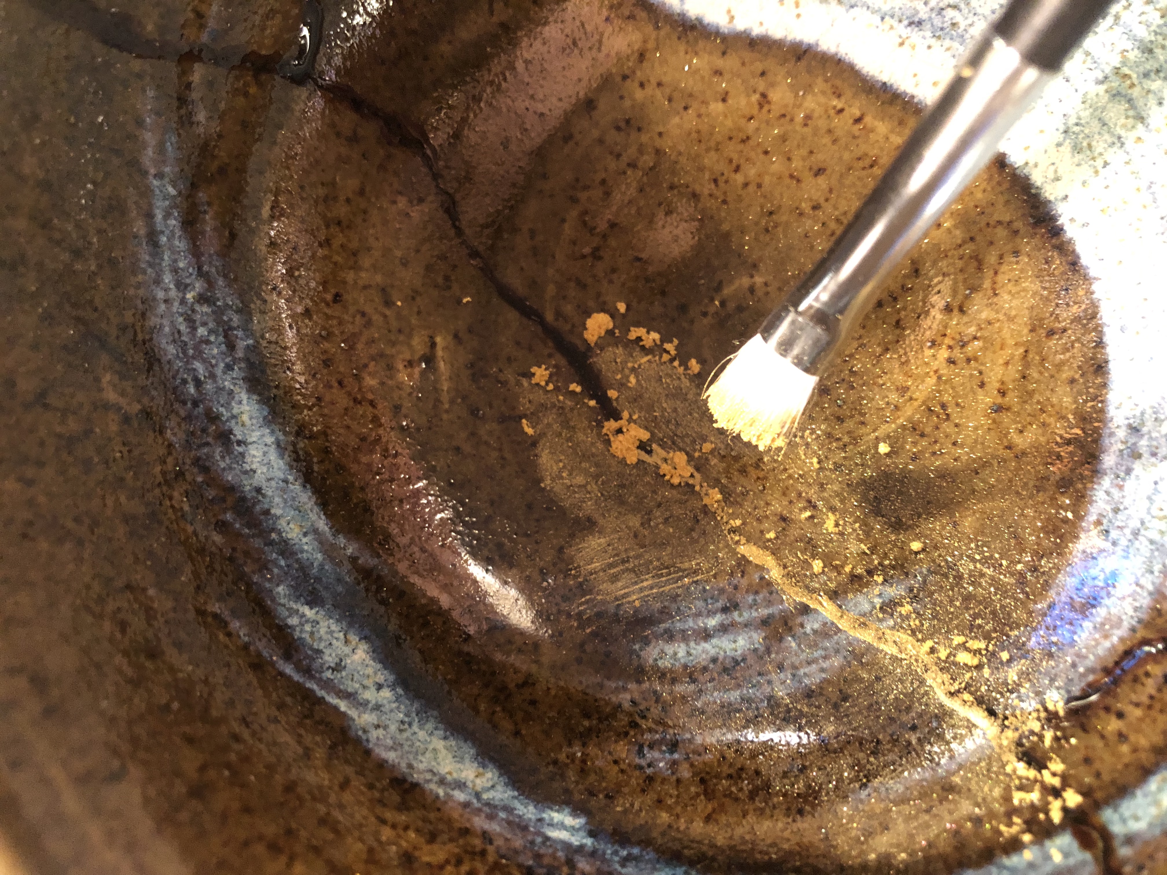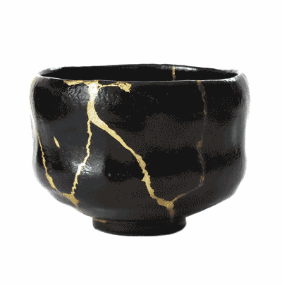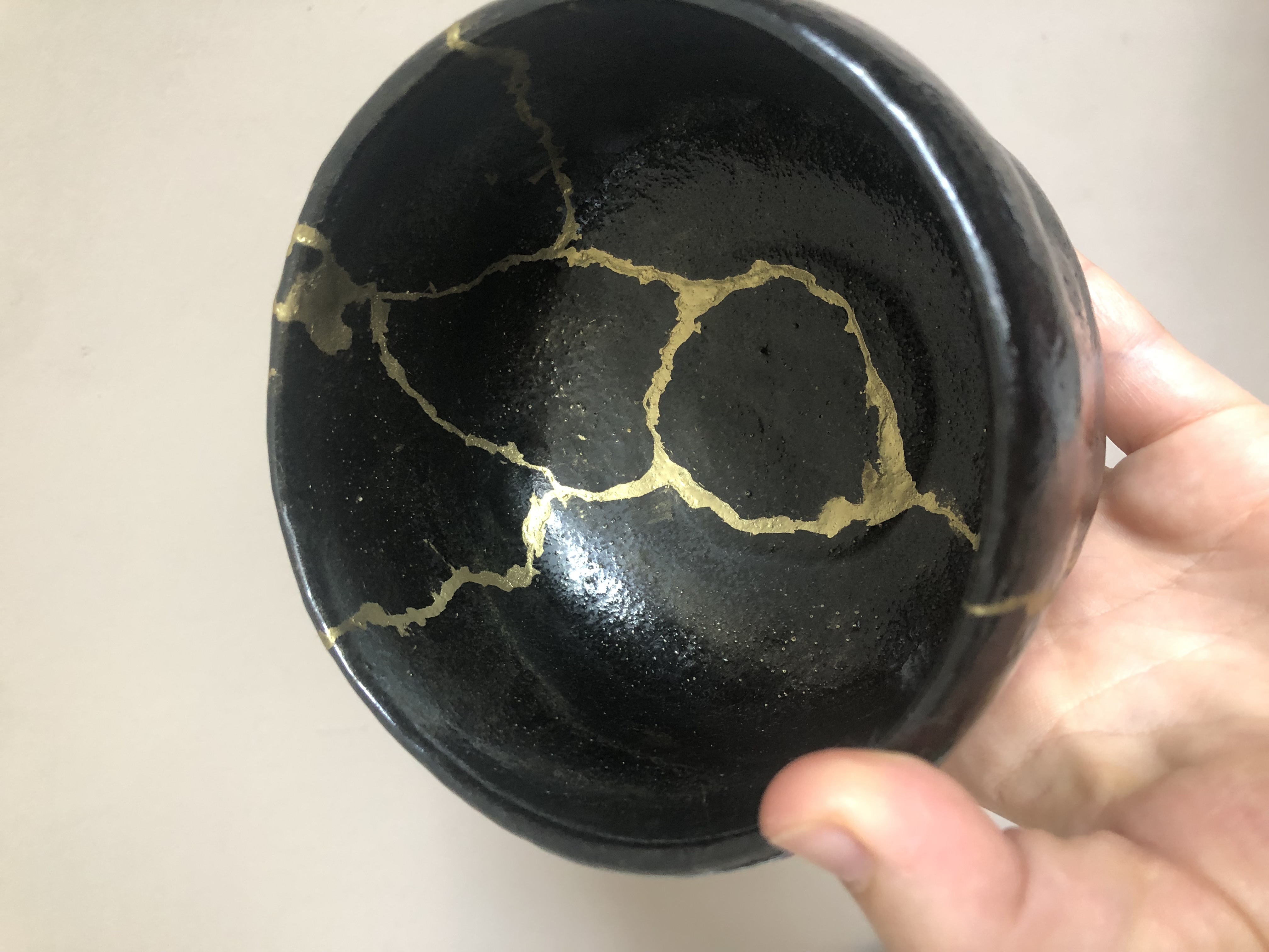 Kintsugi, 金継ぎ= etwas mit Gold bzw. Metallpulver zusammenfügen. Kintsugi ist eine traditionell japanische Methode zerbrochene Keramik mit Urushi, einem natürlichen Lack gewonnen aus dem Saft des Urushibaumes, und Goldpulver zusammenzufügen.